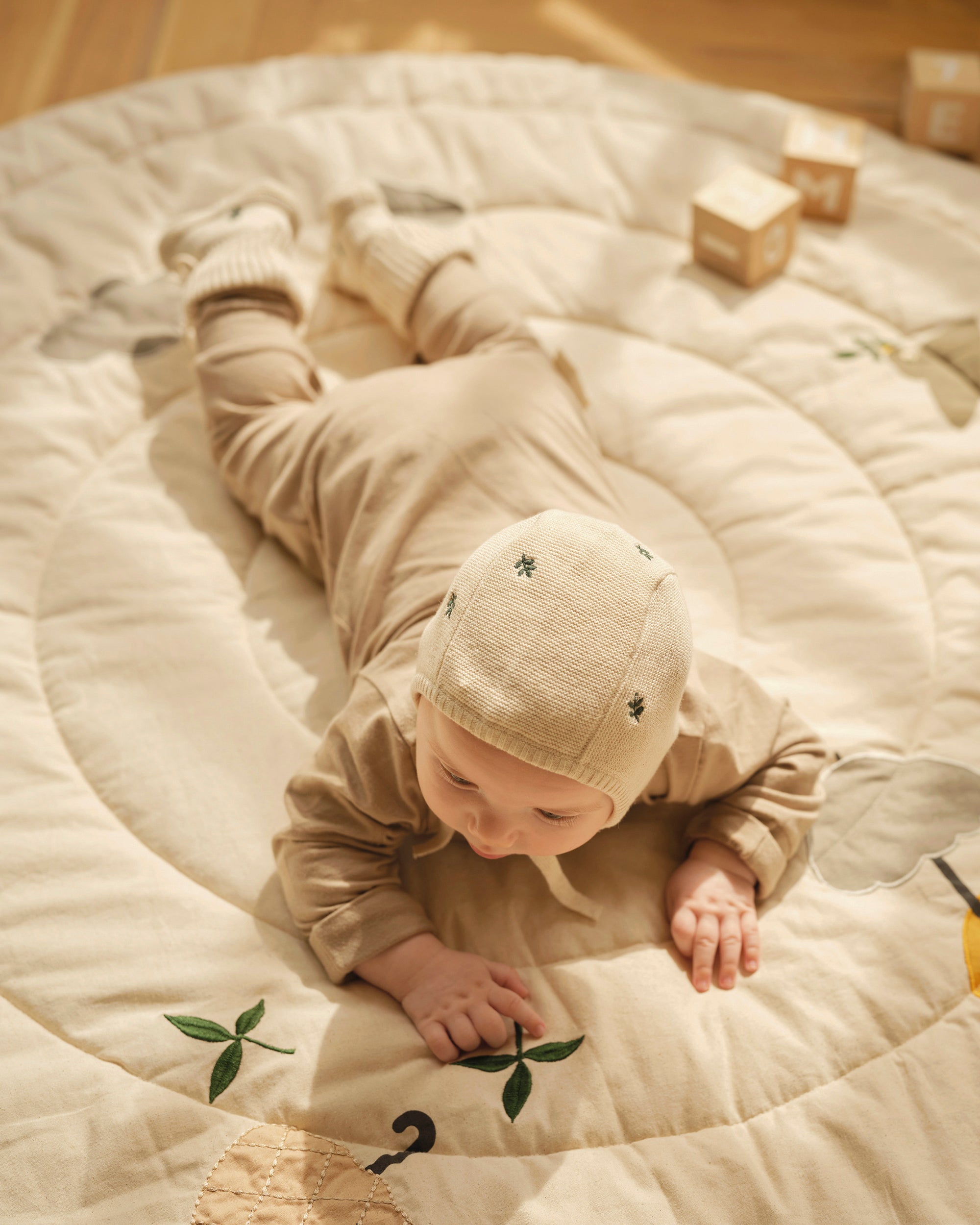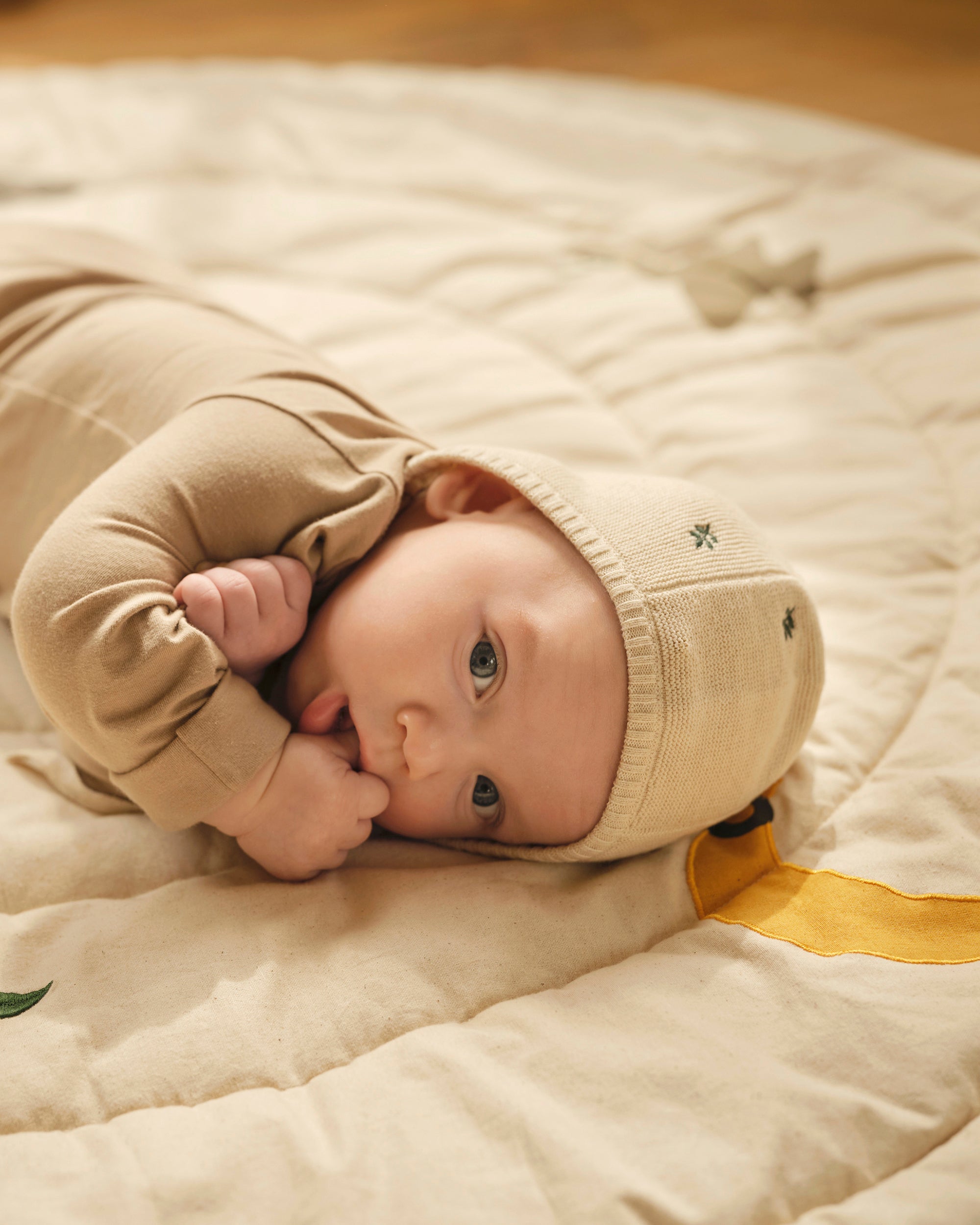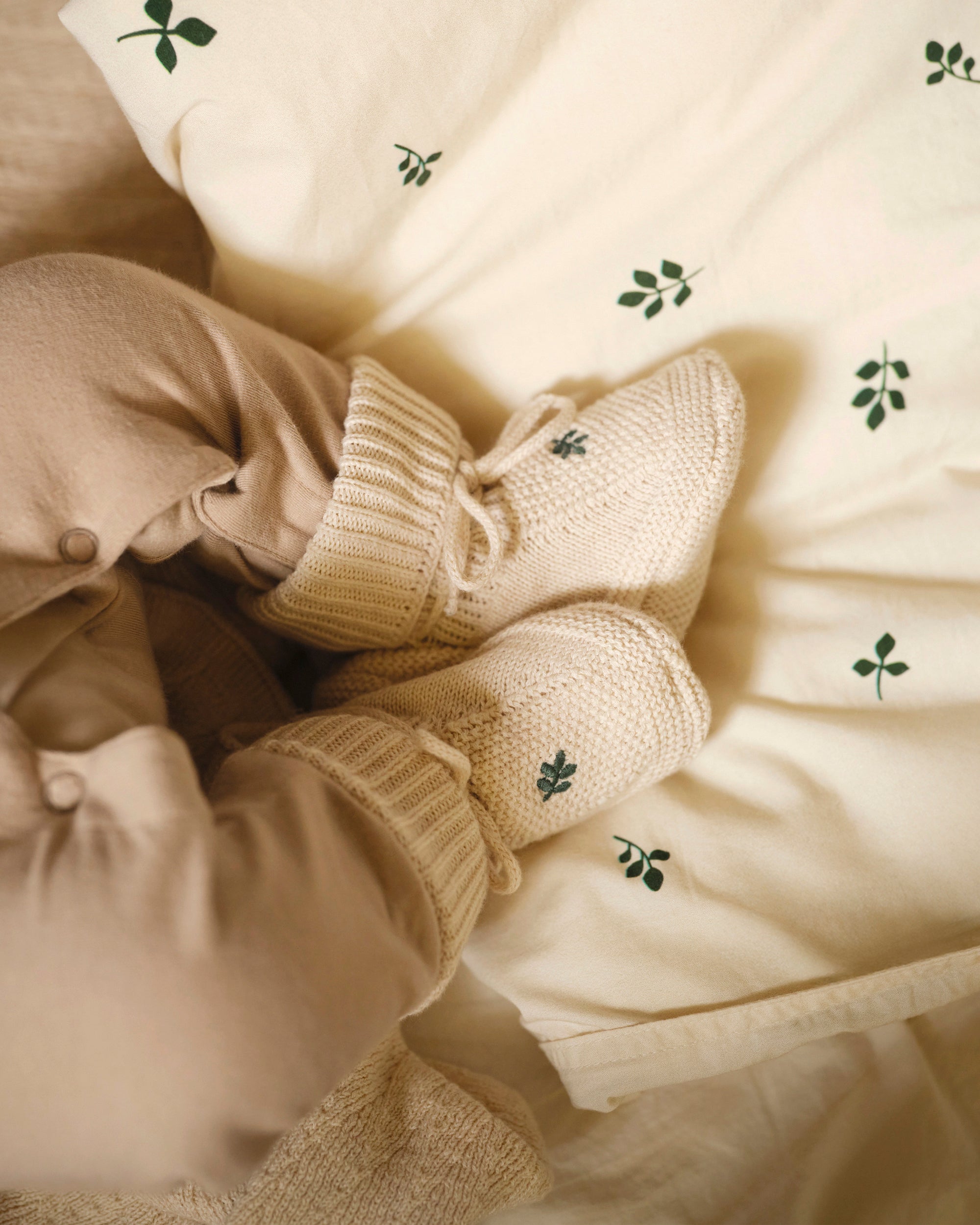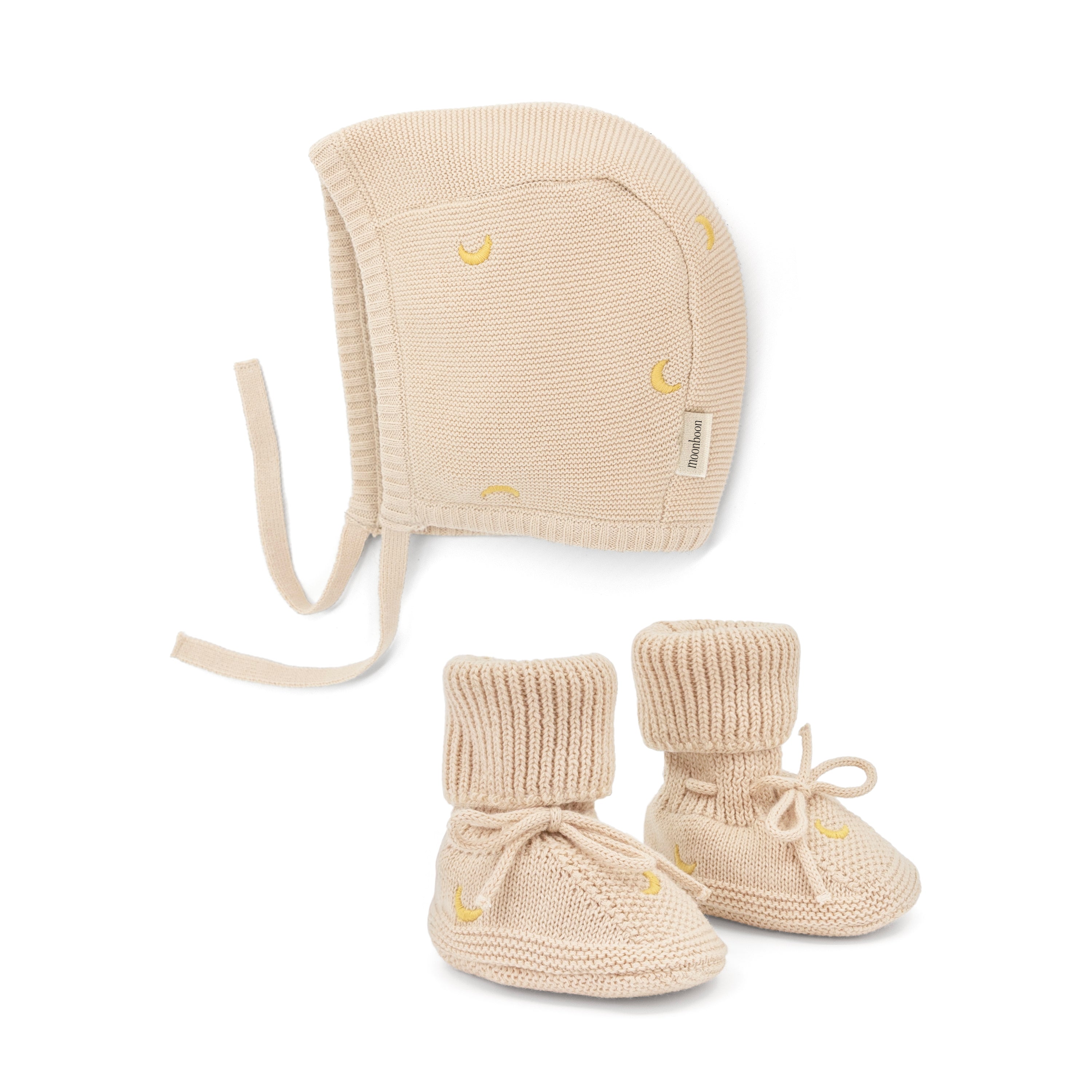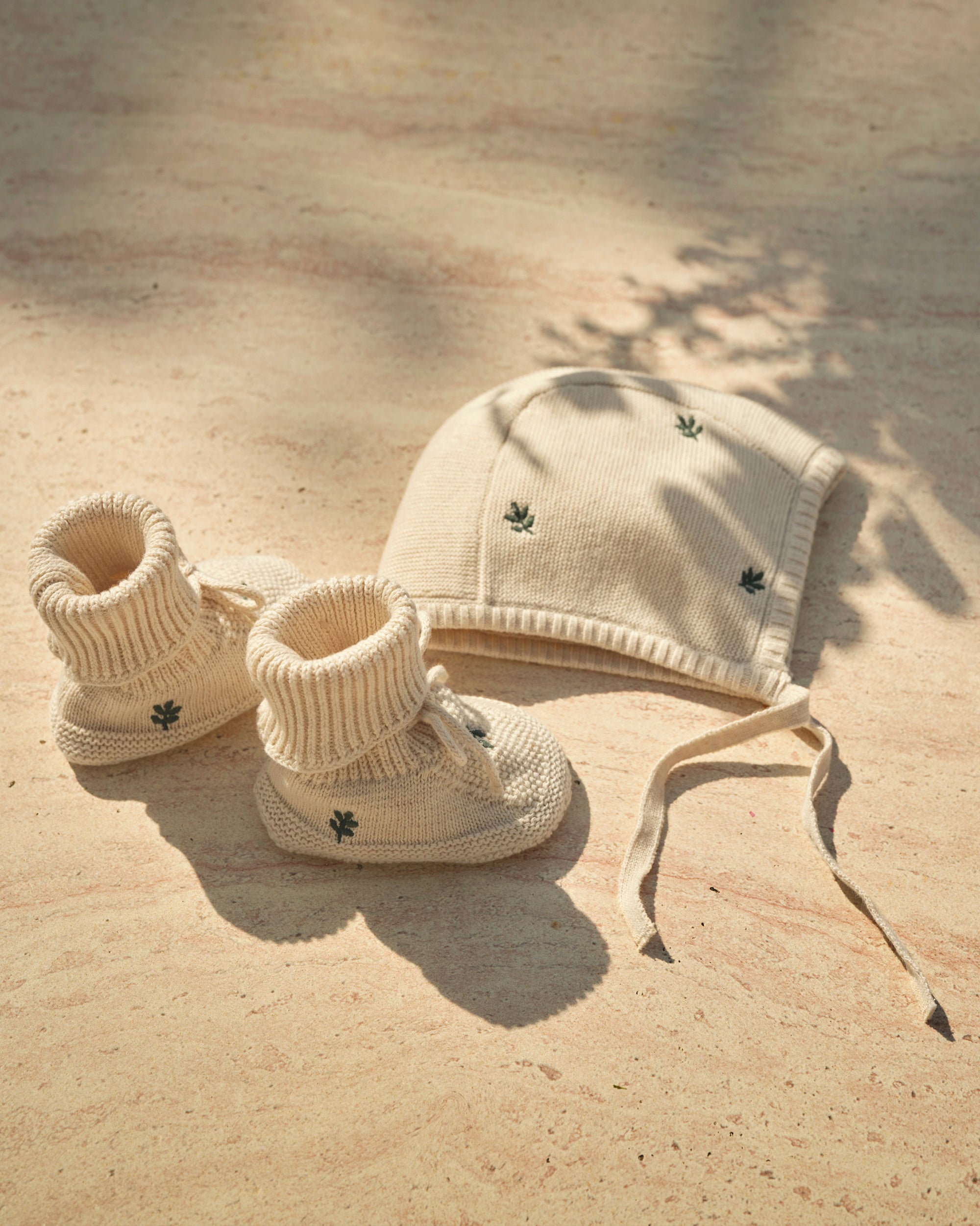 Matching knitted bonnet and booties, carefully crafted in certified organic cotton with delicate embroidery, keeping baby cozy and comfortable all day. A sweet choice for a coming-home outfit or a thoughtful gift all year round.